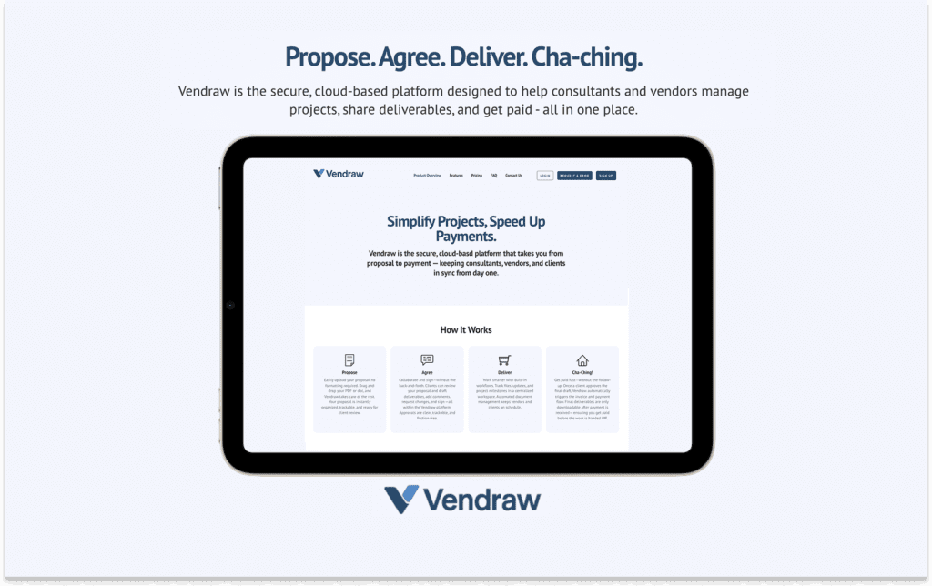 - Kromeon was engaged to design and build the entire Vendraw platform from the ground up, following an agile development process. This included initial requirements gathering through stakeholder workshops to identify pain points in vendor-client interactions, followed by wireframing and prototyping for user-centric interfaces. Iterative sprints involved backend development for secure data handling and payment integrations, frontend enhancements for collaborative features, and rigorous testing phases (unit, integration, and user acceptance) to ensure reliability. Post-launch, Kromeon provided deployment support and initial monitoring to optimize performance, resulting in a fully functional platform that addressed all core challenges.